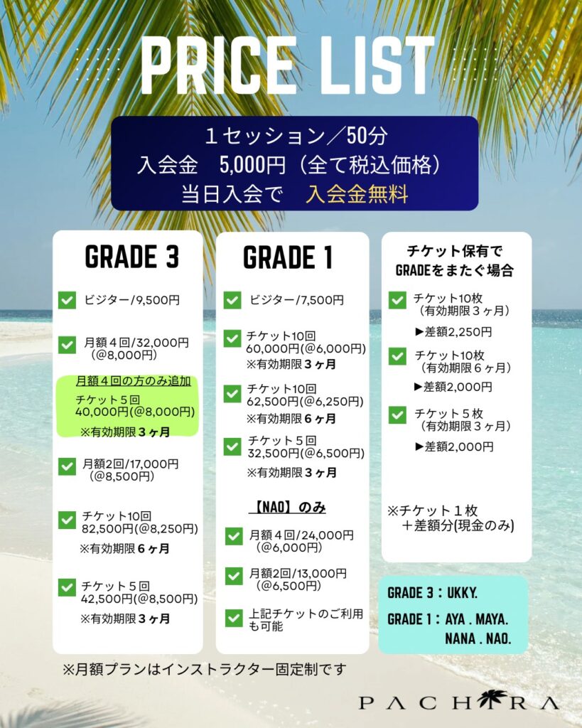 Pachira Pirates Studioの料金体系は、インストラクターのグレードにより異なります。